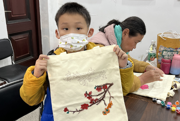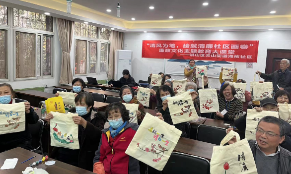 为了让社区退休老同志及居民更加深入理解“廉洁”二字的涵义,活动最后科普老师为居民发放“廉洁环保袋”的制作材料,大家挑选样式不同的环保袋,并充分发挥丰富的想象力,认真地在帆布袋上绘画、涂色,画出自己心中的“莲与廉”,一朵朵莲花在袋上悄然绽放,廉洁之雨浸润着每个居民的内心。历经半小时的创作,原本简单的白色帆布袋被点缀一新,一个个清新雅致、象征清正廉洁的帆布袋诞生了。