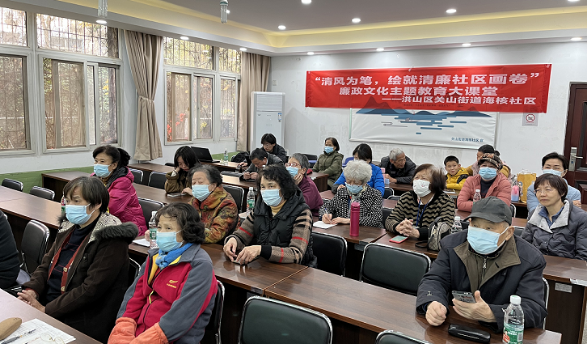 为持续推进社区清廉建设,让廉洁文化贴近实际、贴近生活、贴近群众,增强社区清廉文化建设影响力,营造风清气正的社区环境。12月6日下午,洪山区关山街道海核社区组织40余名社区退休老同志及居民开展以“清风为笔·绘就清廉社区画卷”为主题的清廉科普活动。
