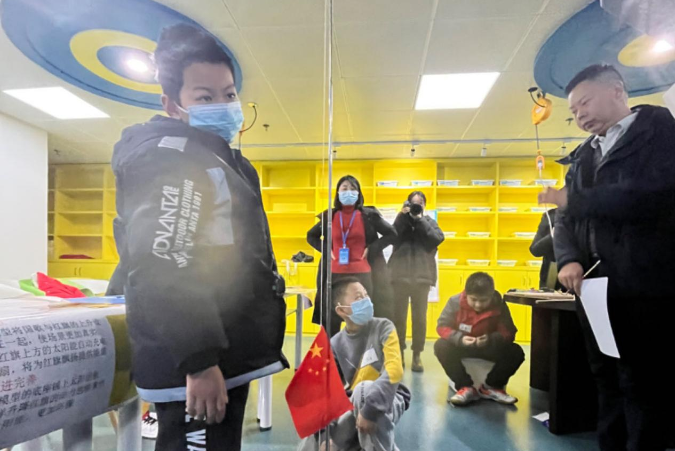 如何能当国歌结束时准时把国旗升到旗杆顶点?如何让国旗在无风的情况下迎风飘扬?东方红小学和崇仁路小学的张皓博、易文杰带来了他的解决方案,一款学校升旗装置的创新设计,只见他轻按开关,国旗在国歌声中徐徐升起,“升旗为电动模式,用调速模块和减速电机以及双控开关来进行控制。”张皓博介绍,旗杆的上方设置太阳能自动充电遥控风扇,保持红旗迎风飘扬。