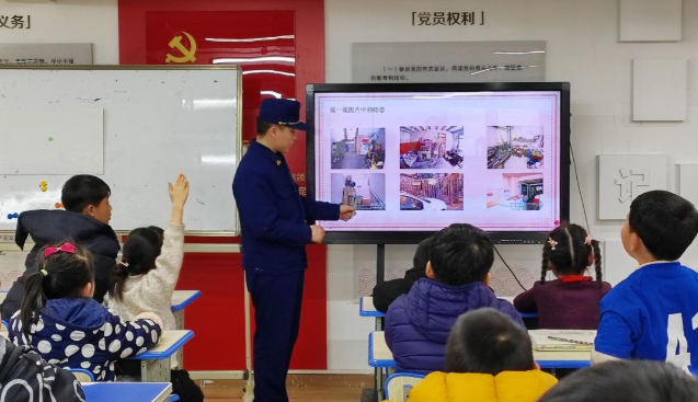 二七路消防救援站的消防官兵程欢通过直观的视频、生动的图片,用轻松易懂的“小”语言,讲述事关生命的“大”安全。为孩子们详细讲解火灾发生的原因,预防一氧化碳中毒的安全常识,生活中常见的消防标志,以及正确用火、用电等安全知识。