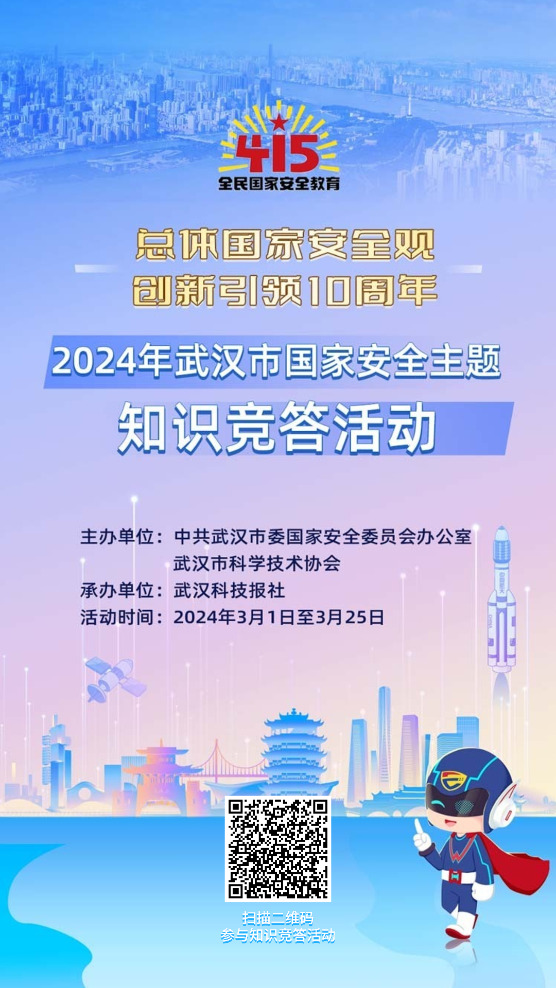 今年是习近平总书记创造性提出总体国家安全观10周年,4月15日是第九个全民国家安全教育日。为全面宣传贯彻总体国家安全观,不断增强全民国家安全意识和素养,营造浓厚的国家安全宣传学习氛围,由中共武汉市委国家安全委员会办公室、主办,武汉科技报社承办的2024年武汉市国家安全主题知识竞答活动将于3月1日正式启动。