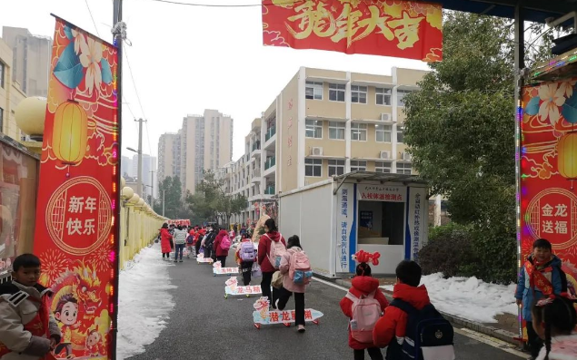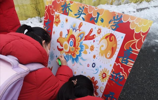 桥头小学门口热闹非凡!学生们身着喜庆的红色服装,戴上鲤鱼头饰,奋力跳过一道道“龙门”。在“画龙点睛”画板前学生们手持画笔,画龙纹,绘龙身,每一笔都寄托着对新学期的期望和憧憬。