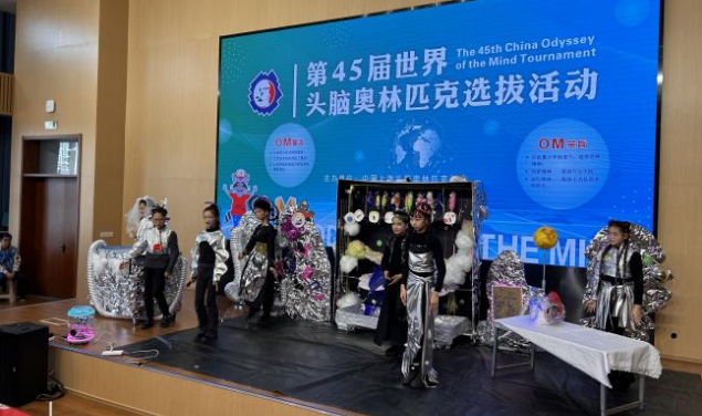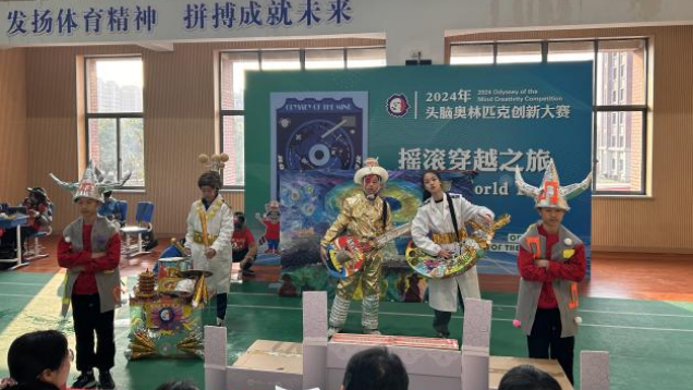 每一道赛题都没有标准答案。长期题《摇滚穿越之旅》中的附小OM队伍——江豚乐队和朋友们,身着DIY服装,奏响原创“沉豚竞跃鼓”,演绎了一场幽默灵动的摇滚之旅!爱祖国爱家乡是科技创新的底色,附小OM队员用这样的情怀编写解题剧本,叠加箱体几何翻转的巧妙创意,生动诠释了科技创新艺术!