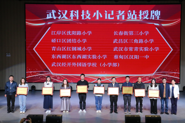 当天,周建新、张若光、张念强、陈菁和刘军为荣获“我的科学梦”武汉市第十届中小学生科普征文优秀组织单位颁奖;吴宇明、陈金枝、徐继胜为东西湖区东西湖实验小学、武汉经开外国语学校(小学部)、青山区红钢城小学、武汉市常青实验小学、江岸区沈阳路小学、武昌区三角路小学、蔡甸区汉阳一中、硚口区团结小学、长春街第三小学9家获得武汉科技小记者站的学校授牌。