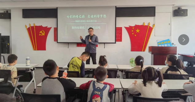 活动开始,庞老师为社区青少年讲解无线电的科学知识,结合日常生活介绍无线电在生活中的作用。同时向青少年们播放了关于无线电知识的学习小视频,社区青少年不时地提出自己的疑问和想法。通过观看视频,社区青少年们对无线电有了更加深入地了解,也对他们制作收音机产生了浓厚的兴趣。