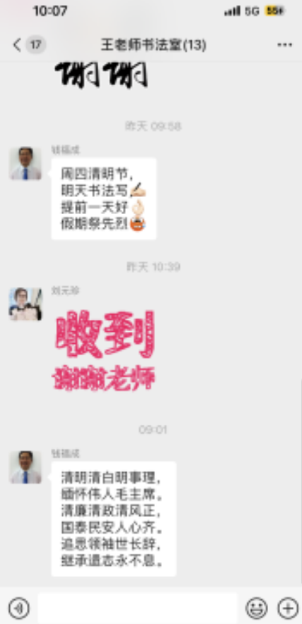 几千年来,人们在这个“气清景明”的节气中,进行“祭之以礼”的追远活动,为已逝的亲人、祖先,庄重地送上自己的思念与敬意。这神圣的生命交流仪式,一年年轮回、一代代传承,构成了人们顽强生存和追求幸福的重要动力。活动中,书法班的老师向社区居民及科技志愿者们介绍清明节的由来和习俗,并为大家准备了关于清明节的古诗词,书写班的钱福成班长还作诗一首:“清明清白明事理,缅怀伟人毛主席。清廉清政清风正,国泰民安人心齐。追思领袖世长辞,继承遗志永不息。”,他们书写的不仅是词句,更是对传统文化精髓的传承和对现代文明风尚的倡导。活动现场墨香四溢,大家在书写中交流心得,用笔墨传达对先人的敬意与思念,共同营造充满文化气息的社区氛围。