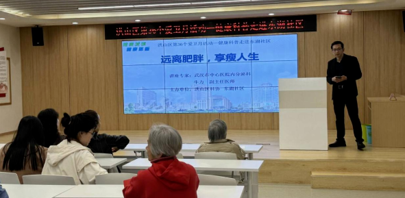 在梨园街道东湖社区的社区党员活动中心,来自武汉市中心医院杨春湖院区内分泌科的牛力副主任医师给社区居民们讲授了题为《远离肥胖、享瘦人生》的科普讲座,他用通俗易懂的语言和生动的事例,向现场的居民详细讲解了肥胖的危害、如何有效预防肥胖以及发生肥胖如何进行干预治疗等知识。