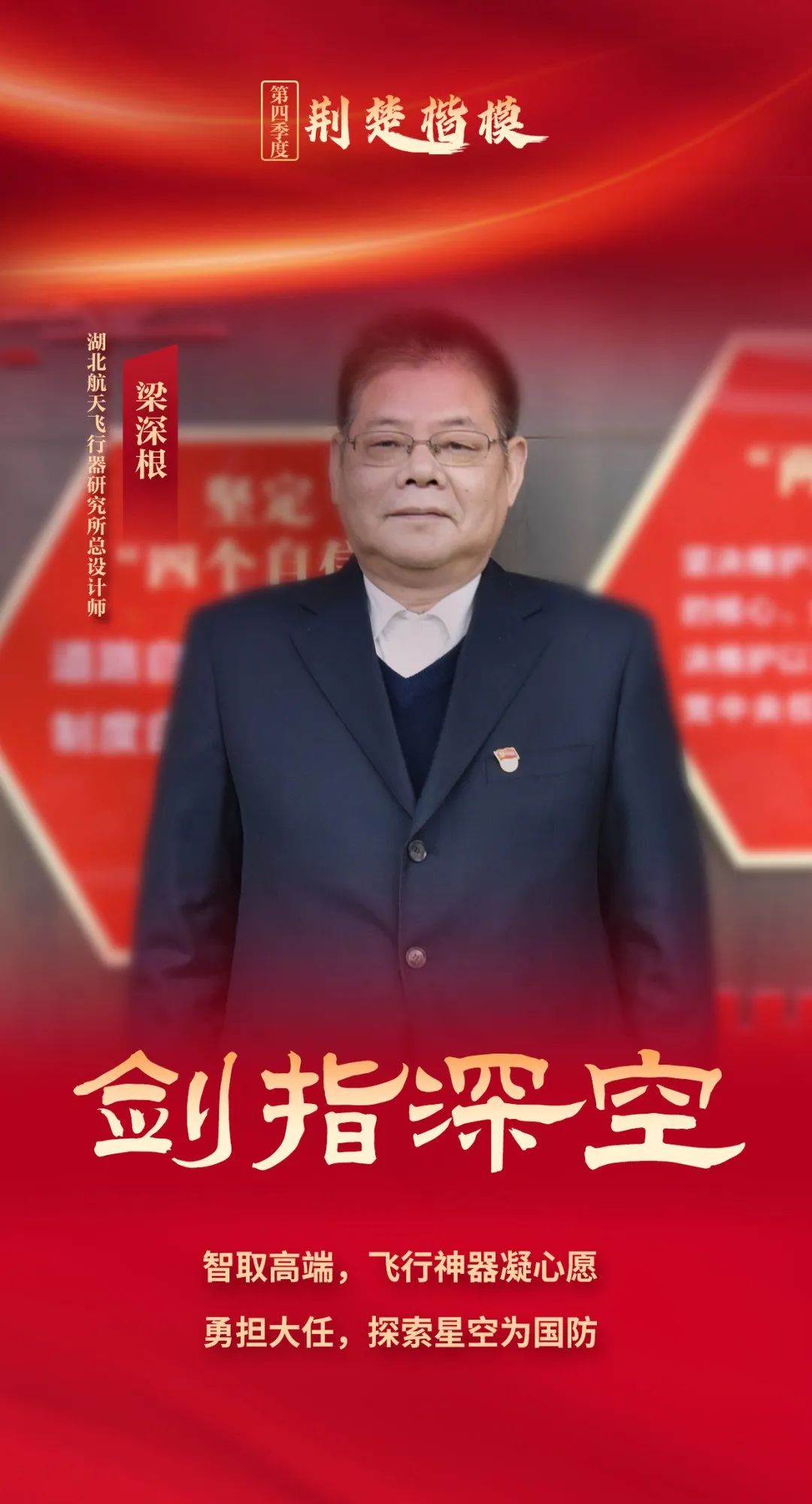 谋事业为大家,抓科研舍小家。湖北航天飞行器研究所总设计师、项目技术总负责人梁深根扎根航天事业一线近四十载,凭借爱岗敬业的钻劲、开拓创新的拼劲、甘于奉献的韧劲,用行动脚踏实地诠释了“工匠精神”。