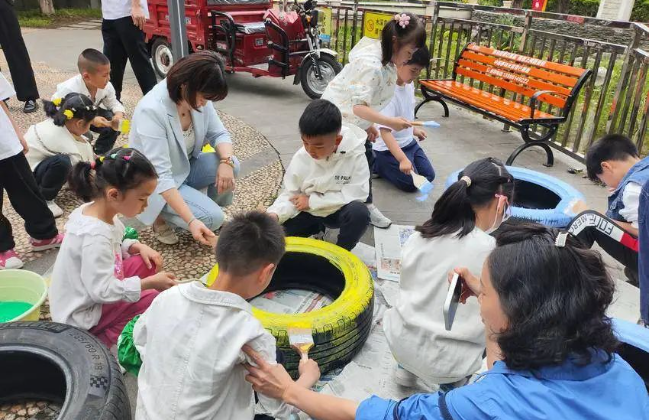 “共建花园”设有创意彩绘区、“绿色园艺”植树区和新景创意区3个区域。参与活动的学生在志愿者的指导下,亲自动手,让废旧轮胎变成色彩缤纷的艺术品,把矿泉水瓶改造成小花盆、种上绿植。“共建花园”被装点得十分好看。