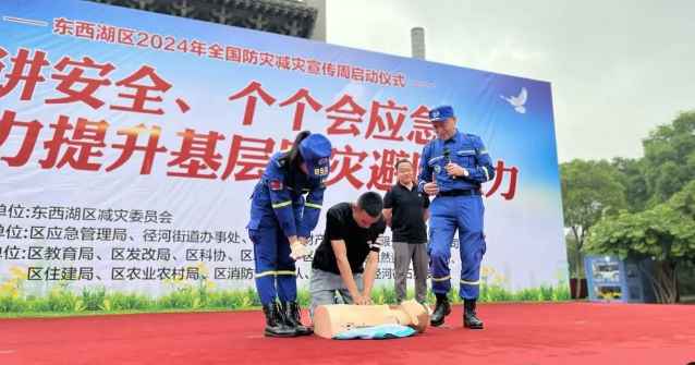 为迎接我国第16个防灾减灾日的到来,广泛宣传防灾减灾应急知识,提升人民群众自我保护意识和自救互救能力,5月11日上午,由东西湖区减灾委员会主办,区应急管理局、径河街道办事处、平安财产保险股份有限公司湖北分公司承办,区发改局、区科协、区教育局、区水务局、区气象局、区自然资源和规划局、区住建局、区农业农村局、区消防救援大队、区卫健局、径河街石家坡社区协办的主题为“人人讲安全,个个会应急—着力提升基层防灾避险能力”的宣传教育活动在码头潭公园东入口广场举行。