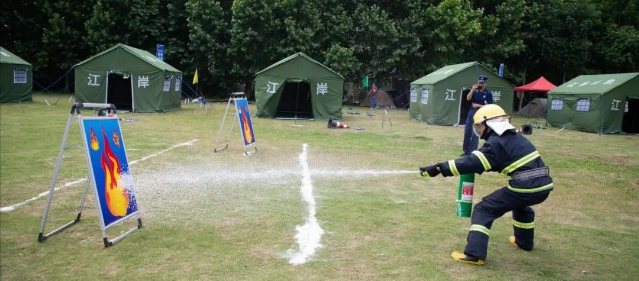 在基层应急技能比武现场,来自街道的 16 支应急救援队伍同场竞技,开展应急帐篷搭建、个体防护及初期火灾应急应对、移车器使用、微型消防车操作等四项基本技能比拼,展示和提升应急救援队伍的专业技能及团队协作能力。活动现场,江岸区医疗救护应急队、供水抢修应急队、防渍排涝应急队等 20 支专业队伍还参与了应急拉动,江岸区宝捷应急救援队、武汉市第二十中红十字志愿服务队分别进行无人机抛投灭火和紧急救护的表演展示。