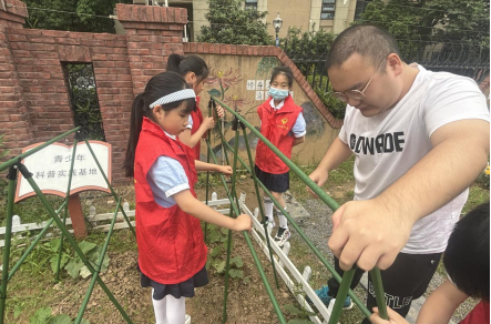 当日清晨,社区工作人员与老师带领着 10 名十二小的学生来到社区共享小院的青少年科普实践基地。活动初始,学生们满怀好奇与兴奋,在志愿者何成红阿姨的耐心讲解下,深入地了解实践基地里种类丰富的蔬菜,如黄瓜、丝瓜、西红柿等,对蔬菜的生长特性有了初步认识。接着进入动手实践环节,何成红阿姨先拿起一棵番茄植株,向孩子们展示如何找到合适的位置进行掐尖,她轻轻用手指捏住顶端的嫩梢,然后果断地掐掉,边操作边详细解释这样做可以促进侧枝生长和果实发育。之后,何成红阿姨教孩子们怎样正确的为蔬菜浇水和施肥,比如肥料要均匀地撒在植株根部周围,浇水要将水浇在植株根部。整个过程中,孩子们神情专注,认真学习着每一个步骤和要点,收获了满满的蔬菜种植知识与实用技能。活动渐近尾声之时,孩子们开始搭建丝瓜和黄瓜的爬藤架。有的孩子负责递竹竿,有的孩子负责固定架子,他们分工明晰、配合默契,充分展现出了团结协作的可贵精神。