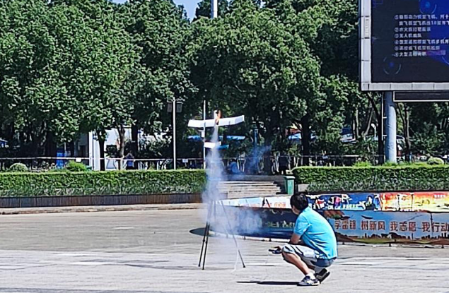 “3!2!1!发射!”活动中,来自新洲区三店街中心小学航模社团的学生,带来了一场精彩模型飞机齐飞和水火箭打靶展示表演,引得现场惊呼不断。伴随着激昂的倒计时,学生代表按下发射按钮,“砰”的一声,随着水火箭在半空划出一道优美的弧线,成功击中目标靶心,每一次成功发射和精准射击都伴随着同学们的欢呼雀跃和热烈的掌声。