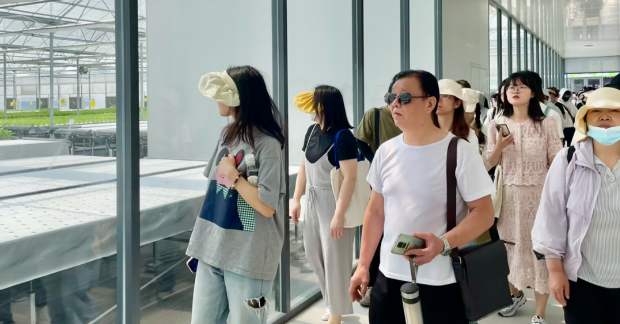 蔬菜工厂的生产环境有着严格的工艺要求,工作人员进入工厂前需要穿戴专用的鞋套和工作服,并通过风淋系统,确保人体身上的灰尘、虫卵不会被带入工厂内,而这是花田果蔬无需打农药的重要前提。此外,通过智能设备,他们可以实时监测农田的温度、湿度、光照等环境参数,并根据数据调整种植方案,实现精准管理。这种智能化的农业管理方式,让志愿者们感受到了科技给农业生产带来的革命性变化。