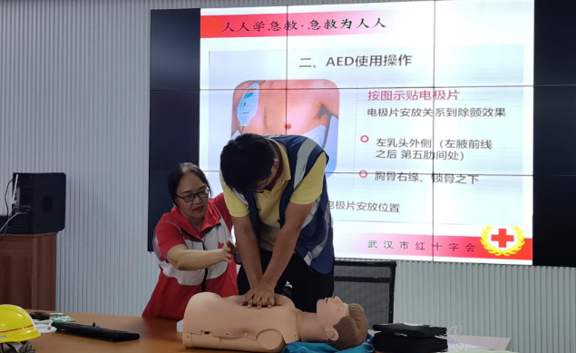 随后,江岸区红十字会的邝老师为工友们带来了一场生动而实用的应急救护知识培训。她首先详细讲解了遇到气道异物梗阻时的紧急处理方法,包括如何正确求救、自救以及救助他人。此外,邝老师还利用人体模特现场演示了心肺复苏的完整流程,从判断意识、呼叫求助到胸外按压、开放气道、人工呼吸等步骤都一一进行了详细解说。为了让大家更加直观地学习救援手法,邝老师还邀请了几位工友上台模拟心肺复苏救援,并亲自指导他们进行配合人工呼吸和AED的使用。整个培训过程中,工友们积极参与,认真听讲,并在模拟操作中不断提升自己的急救技能。通过这次培训,大家不仅掌握了黄金救援时间内的基本急救技能,还提高了在突发情况下的自救互救能力。