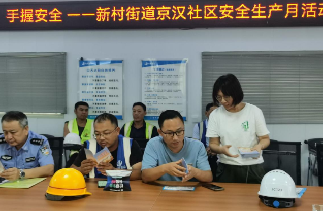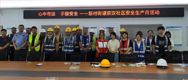 为深入贯彻落实安全生产月活动精神,提高辖区企事业单位安全生产意识和应急救援能力,6月20日上午,新村街道京汉社区联合江岸区司法局、新村街道司法所、新村派出所、江岸区红十字会以及街道禁毒社工,在辖区新希望中天建设P12-1项目工地,开展了一场主题为“心中有法 手握安全”的安全生产科普活动。