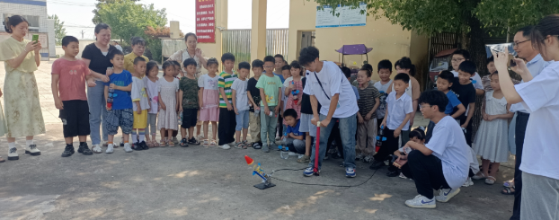 在操场上,由钱学森纪念馆志愿者指导小学生们如何利用矿泉水瓶、胶带等简单的材料,制作小火箭,在制作前志愿者作了示范,讲解了制作技巧要领和注意事项,学生们看得津津有味,小学生配合默契,认真动手做,不一会儿,眼前呈现出一个个小火箭模型,通过这种做游戏的方式让他们了解学习航天科技知识,激发青少年热爱科学、学好科学的兴趣。