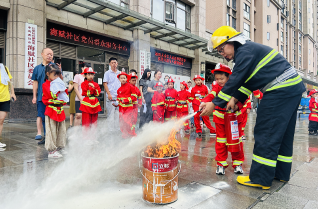 为了让孩子们更好地掌握这些知识,活动还特别设置了消防安全演练环节。孩子们穿上小小消防员服装,仿佛变身成了真正的消防员。在社区工作人员的引导下,孩子们进行了楼道逃生演练。他们按照指示迅速而有序地撤离到安全区域,并学习了如何正确使用灭火器进行灭火。