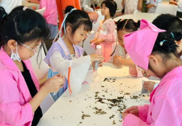 随后,医师带领孩子们认识了生活中一系列常见中药,让孩子们对中药有了更加直观的认识,近距离了解到中医药文化的博大精深。此外,活动还特别设置了“认穴位”环节,通过歌曲、问答等方式,让孩子们在轻松愉快的氛围中学习人体穴位知识并学做养生操,感受中医养生的独特魅力。最令人期待的莫过于制作中药香包的环节了。小朋友们挑选自己喜欢的中药材,金银花、丁香、佩兰、木香……然后,将药材按照一定比例混合在一起,他们小心翼翼地将混合好的中药材放入多彩的小布袋中。不一会儿,一个个散发着淡淡香气的中药香包便诞生了。“爸爸,帮我把香包挂在脖子上!”小朋友们戴着自己亲手制作的香包,脸上洋溢着满满的成就感和自豪感,纷纷拍照留念。