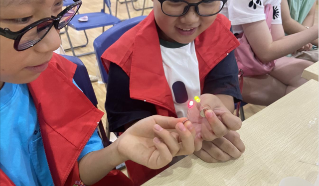 随着台下发出的激烈讨论,李老师为大家揭示魔术背后的科学原理:LED灯泡有正负极之分,也叫做阳极和阴极。一般来说,正极为长脚,负极为短脚,小灯泡正极连接电池正极发出的光就是红色,连接电池负极发出的光就是绿色,通过利用正负极就可以表演出魔术神奇的效果了。“我明白了,其实绿色灯珠一直都在,只是连接方式不一样。”小学员杨绎琛激动地向志愿者说道。