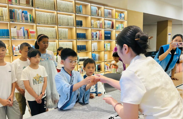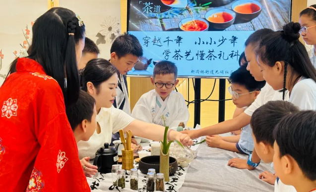 “小朋友们知道有哪些茶或者平时喝到过的茶?”“红茶!”“乌龙茶、茉莉花茶……”小朋友们争先恐后地举手发言。清新的茶香、爽朗的笑声,其乐融融、好不热闹。7月15日,20余名小朋友们身着漂亮的传统汉服,参加了光明社区携手青山区图书馆及新沟桥街道社工站共同举办的“穿越千年 小小少年 学茶艺懂茶礼”暑期科普传承系列活动。