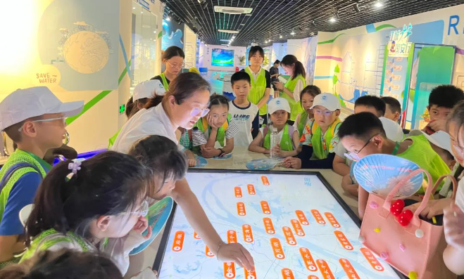 在节水科普知识馆中,通过讲解员的介绍,青少年们依次聆听了“水的起源”“水孕育文明”“生命的年轮”等内容,并通过模拟器亲身感知水的各种形态,在这里他们收获了欢声笑语,更在亲身体验中领悟到了节水的重要性。通过第二期场馆内的模型演示、实物展示、立体影像技术等全方位的场景展示,让孩子们在雨水处理、中水回用、中水洗车等项目中探索用水奥秘,掌握节水妙招。