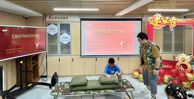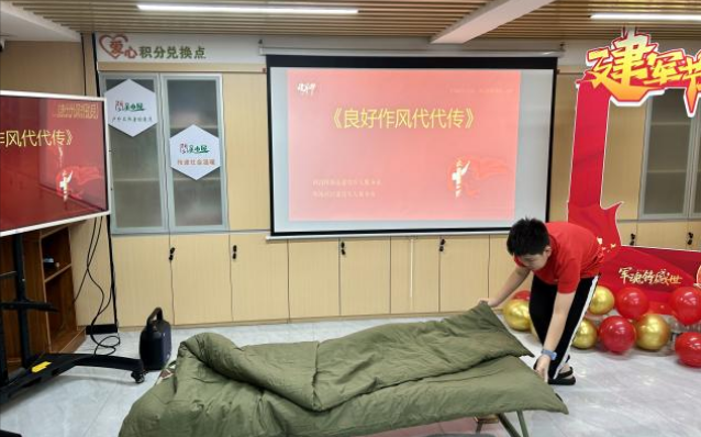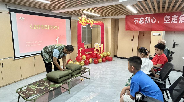 车站社区退役军人们欢聚一堂,分享着当年参军的初心和在部队里的难忘经历,激励着现场青少年们,“当年去参军的时候我们都还是十七八岁的青少年,到了部队白天夜晚都在苦练,虽然身体累但是个个都干劲十足,怕落后别的队友进度,晚上有时候会突然 ‘紧急集合 ’,还不敢睡太死。”同时,活动现场退役军人代表牛杰还给孩子们示范了叠军被,“压实、折叠、合角”一系列行云流水的动作背后是日复一日的练习。方方正正的一个“豆腐块”,是军人们追求细节完美、展现过硬作风的方式。孩子们也纷纷上台演示他们现场所学,感受军人追求细节、严谨认真的生活作风。