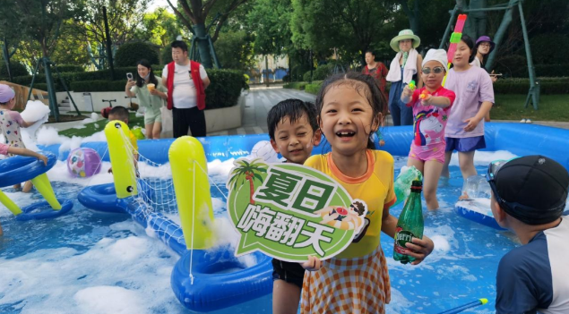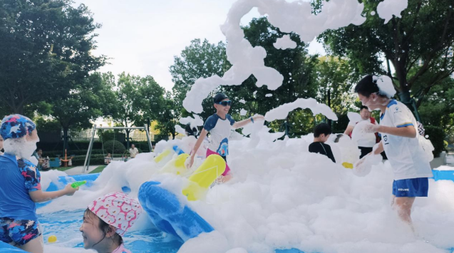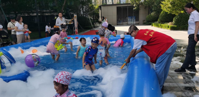 泳池泡泡趴,畅享清凉:活动于炎炎夏日中拉开帷幕,充气游泳池瞬间化身为欢乐的海洋。五彩斑斓的泡泡在阳光下闪烁,为泳池增添了几分梦幻色彩。小朋友们纷纷踏入这片泡泡的海洋,尽情享受清凉与欢乐。孩子们在家长的陪伴下,或嬉戏打闹,或相互泼水,脸上洋溢着纯真的笑容;大人们则在一旁聊天、拍照,享受着难得的亲子时光和邻里间的和谐氛围。