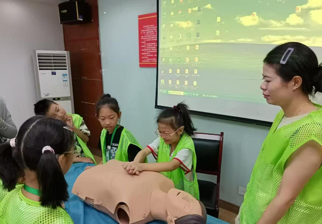 随着气温的攀升,预防中暑及溺水成为安全防护的重中之重。医生通过生动的案例,向孩子们讲解了中暑的症状、危害及预防措施。她建议孩子们在户外活动时尽量避开高温时段,穿着透气衣物,及时补充水分,并教会了孩子们一些简单的自救方法,如使用湿毛巾降温、寻找阴凉处休息等。针对防溺水问题,医生以深入浅出的方式,为孩子们讲解了防溺水的基本原则:“认识水域,量力而行;不单独行动,结伴而游;穿戴救生衣,安全第一。”接着,通过模拟演示,展示了如何在水中保持浮力、正确呼救以及自救互救的技巧。吴家山街卫生服务中心的医生还利用模具一步步演示了心肺复苏的正确步骤,包括判断意识、启动紧急反应系统、检查呼吸与脉搏、胸外按压及人工呼吸等关键环节。为了确保每位孩子都能掌握,医生还邀请了几位勇敢的小朋友上台,亲自指导他们进行模拟操作,让孩子们在实践中加深理解,增强应对突发事件的能力。