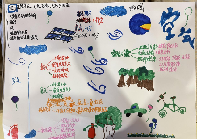 在科普知识讲解之后,进入了分享交流环节。科普老师提出了几个有趣的问题,比如“为什么我们会觉得高原上呼吸困难?”、“空气中的哪种成分最多?”等等。孩子们积极举手发言,现场气氛非常活跃。随后,科普老师引导孩子们将所学的知识用思维导图或图片文字的形式记录下来,加深记忆。