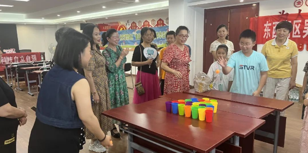 课堂上社工通过动静相结合的托管方式,同时也为我们奥运健儿加油,在完成书法作品后开展了“乒乓跳跳跳”的亲子趣味游戏。该游戏巧妙地将传统乒乓球运动与趣味挑战相结合,让孩子们在欢笑中锻炼了手眼协调能力和反应速度。孩子们全神贯注地控制着小球跳跃的节奏,每当小球成功落入指定区域,便引来周围观众的阵阵掌声和欢呼声。