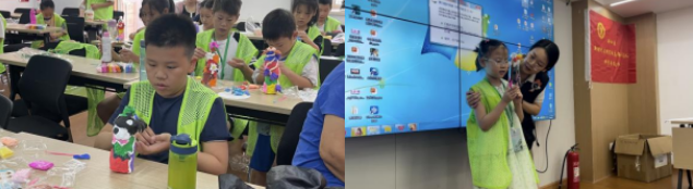 在动手环节,老师首先进行了分步讲解,并对每一步的重点与难点进行了着重强调,然后带着大家一起动手实操,在制作的过程中,大家发现这么小小的瓶子居然可以做出这么多造型,对此感到不可思议,发出了感叹与惊喜。并且大家的制作热情和兴趣一下子又被激发起来了,对制作成品充满期待。小朋友们不断发挥着天马行空的想象力,对细节进行了精细化处理将塑料瓶变废为宝,所有步骤完成后,色彩绚烂、妙趣横生的“DIY”花瓶就做好啦!大家看着自己亲手创造的手工制品,喜悦之情也是溢于言表的。小朋友们还给自己的作品取了独特的名字,每一个小小“创作家”踊跃上台和大家分享了自己的创作过程、创作思路.......