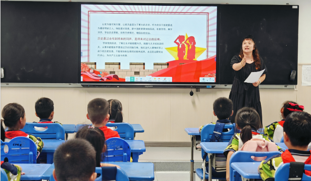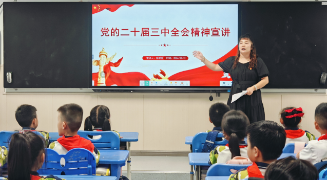 青年宣讲团成员朱靓雯老师以贴近学生们生活的方式,深入浅出地讲解了党的二十届三中全会精神,让学生们了解到国家未来发展的宏伟蓝图。她鼓励学生们从现在开始树立远大理想,将个人的成长与国家的进步紧密相连,为实现2035年的宏伟目标贡献自己的力量。朱老师还强调了学好党史的重要性,让学生们铭记历史使命,增强历史责任感和使命感。为了激发学生们的兴趣,朱老师讲述了“刘九书柜”的故事。她希望重视读书、善于学习的理念能够在学生们的心中生根发芽,从党的科学理论中悟规律、明方向、学方法、增智慧。