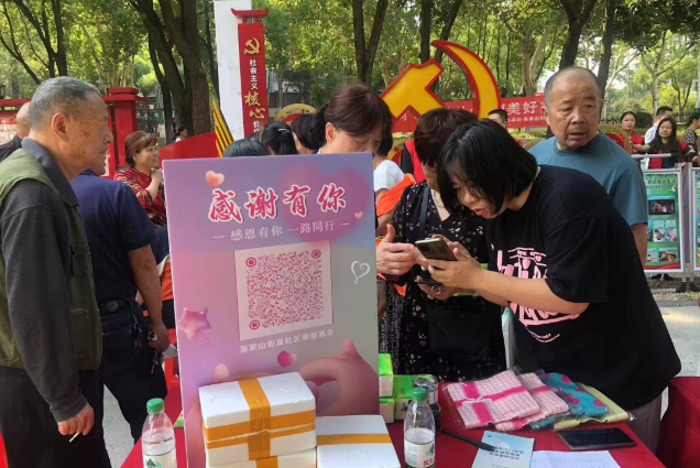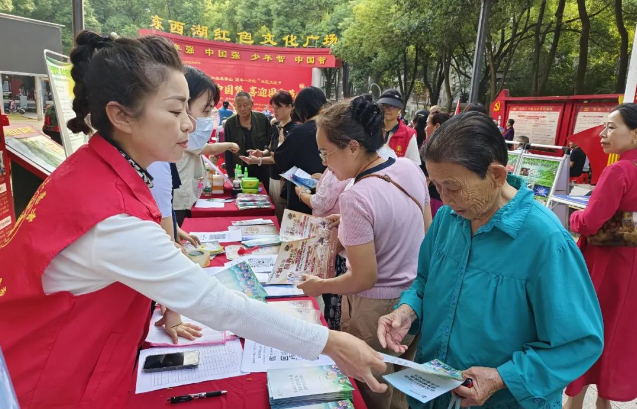 除了精彩纷呈的文艺汇演,在舞台的另一边,望丰社区新时代文明实践站还特设了一个科普角,向来往的居民进行各类知识的科普。在医保政策宣传摊位,望丰社区的工作人员们热情的向来往居民科普2025年居民医保政策、延迟退休政策。而在防诈骗科普摊位前,汉口银行东西湖支行的工作人员则耐心地向爹爹婆婆们传授各种反金融诈骗小技巧,防止老人们上当受骗。除此之外汉口银行的工作人员还向现场的群众进行社保卡金融功能推广。吴家山街社区戒毒康复中心的社工们则细致耐心地向现场的观众科普禁毒知识,而吴家山社工站的社工们则在爱心摊位上呼吁来往观众进行公益募捐。